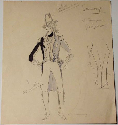 • Man i ljusblå uniformsrock med epåletter, svart i hals och på högerarmen, vita byxor, höga knäppta damasker, hög hatt. Vid sidan: beskrivning på rockuppslag.