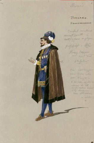 BASSANIO. PROMENADDRÄKT. (med tusch) Rosén. Veckad venetiansk sammetsbarett i hattfacon m. plym. Puffdrägt. Blå. Brun kappa med svart bård. Klaffskor. Obs! överkappan kan äfven sitta som "tonglet"...