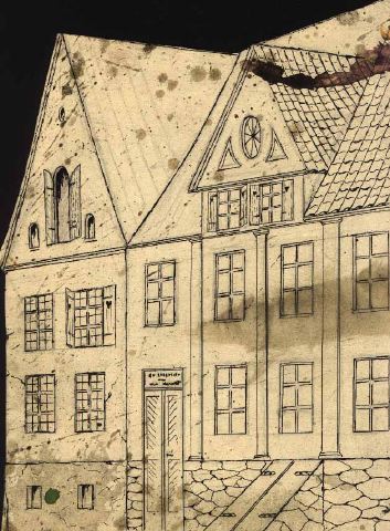 Troligen del av scenmodell. Två husfasader, varav den till vänster är en gavel med sadeltak. Översta våningen har ett bågformat fönster (?) med halvöppna luckor, på var sida en bågformad glugg och överst en rund glugg. Under en gesims, två våningar med vardera två fönster, ett av dem med hjärtförsedda fönsterluckor, stenfot med två källargluggar. Den högra fasaden har tvärgavel med dekorationer och rundfönster, samt därunder två mindre fönster med luckor. Fasaden har ytterligare två våningar, den övre med fyra fönster, undervåningen med tre fönster och en port med två dörrar, skylt över dörren. Mellan fönstren, från stenfoten upp till tvärgaveln, tre pilastrar. Från stenfoten är murat två snedställda källardörrar.