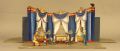 Rum med blå väggar som på bakgrundsväggen har tre stora fönster med dekorativt draperade gardinuppsättningar, på golvet pidestaler med blommor, soffa, bord och stolar, till vänster en kvinna och en man vid en spinett.