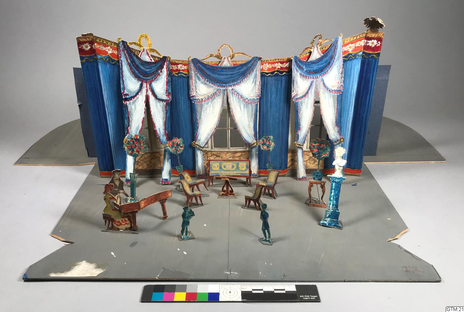 detaljer av papper delvis monterade på ståltråd och limmade på grundplattan med utskuren framscen, dekoren av papper tejpad på grundplattan, gardinerna är löstagbara och vilar på kanten med hjälp av fastlimmad papperskiva. grundplattan är av kartong