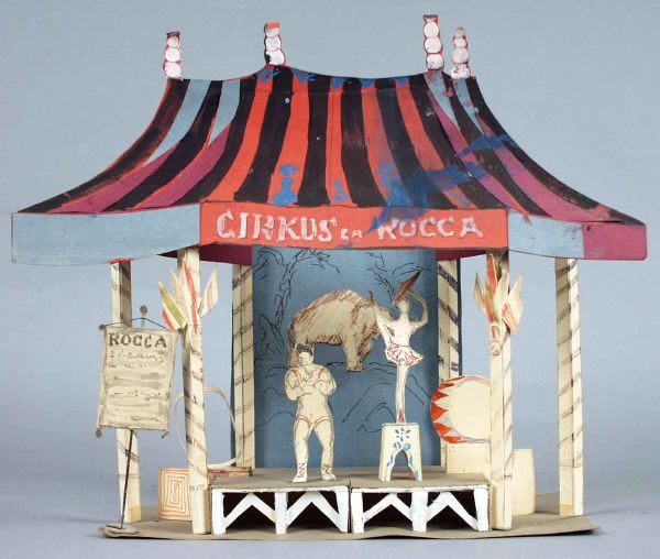 På uppbyggt podium står två figurer, en man i brottarkostym, en kvinnlig akrobat med uppsträckt ben, över dem ett randigt cirkustak med stolpar som stöd, på en skylt t v samt med stor skrift på cirkustakets kant CIRKUS LA ROCCA, en elefant på den blå fondväggen.