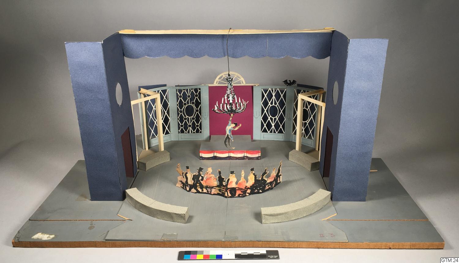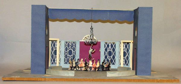 Grå grundplatta med grått pålimmat scengolv efter scenbildens mått, grå väggar på båda sidor (samma som GTM:23), bågformade bänkar på framscenen och vid väggarna insidor, fondväggen har stora mönstrade fönster, i mitten ett rosalila väggfält, framför det långbord med sittande figurer )lös del och osäkert om placeringen var så), stor takkrona i mitten där en mansfigur hänger fast med ena armen.
