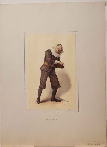 Man med långt grått hår och kalott på huvudet, är iklädd vit skjorta med rund kråskrage, brun jacka med sjömanskrage och brett bälte, knäbyxor, svarta strumpor, svarta skor. I händerna håller han ett ...
