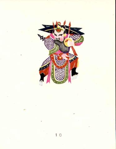Kinesisk rollfigur med mask och grått skägg iklädd omfångsrik huvudbonad i grönt och svart med rödgul dekoration, fiskfjällsmönstrad rock med tungformade skörtar, rött bälte, röda påsbyxor, svarta stövlar. I vänster hand håller han ett gult klot, i höger, under armen, ett spjut eller en spira.