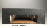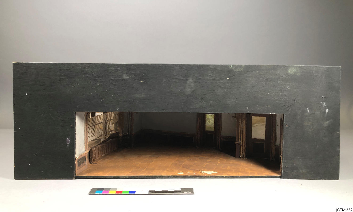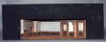 Svart proscenium i trä till ett rum med ljusblå väggfält och bruna paneler, brunt prkettmönstrat golv, vänster sida har ett brett fönster med nerdragna persienner, under det ett värmelement med tillhörande rör som går in i och upp efter hörnet, ytterst på höger sida en inbyggd hatthylla, i vinkel en dörr med glasruta med TUR-X-ROOM på utsidan, fondväggen i bred alkov har en dörr med glasruta med texten MEN, rummet är överbyggt med tak, exteriör vy på vänster sida med husfasader.