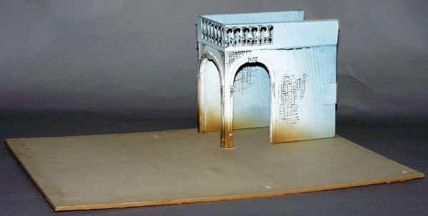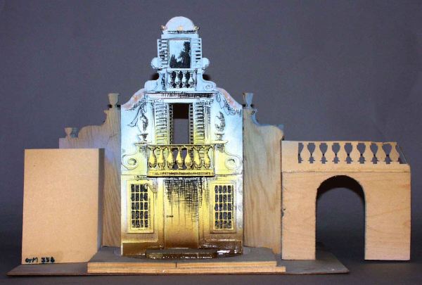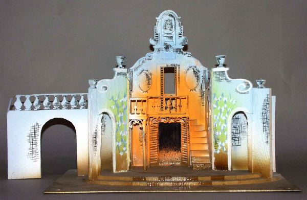 Två delar där -c troligen är ett komlement. _a: ljusblå fasad med inslag av gult och brunt. Fönster på var sida om entrédörr som har schackmönstrad trappa framför och balkong på övervåningen med balustrad och jalusidörrar, överst ett torn med liten balkong och fönsterluckor. _b: är interiör till _a-bilden och gjord i samma färgskala men med sidoväggar som har blommönster i pastellfärger och har bågformade öppningar, schackmönstrade trappavsatser framför, på mittväggen en trappa som leder upp till övervåningen med avsats och balustrad och en dörr som för ut till balkongen på framsidan. Dekorens mittenparti har en vridbar rund platta på vilken dekoren är limmad och går alltså att förvandla från exteriör till interör._c: ljusblå fasad med bågformade portaler i vinkel.