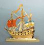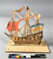 • Ett skepp (brigg ?) med rött segel, vimplar och vajande fana i blått, vitt och gult.