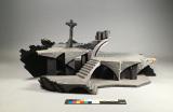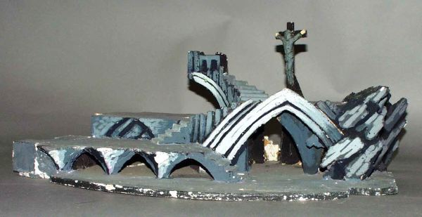 Scenbilderna uppbyggda i olika avsatser med trappor och valv som binder dem samman, översta avsatsen har ett krusifix, t v om den avsatsen en trappa som leder upp till en utbyggnad påminnande om en predikstol. Modellen är målad i gråblå nyanser.