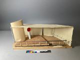 Båtdäck med reling på framscenen och efter den rundade högersidan, tältduk (segelduk) spänd runt sidor, fond och tak med öppning i fonden, en stor ventilskorsten kommer upp från golvet, rödmålad inuti...