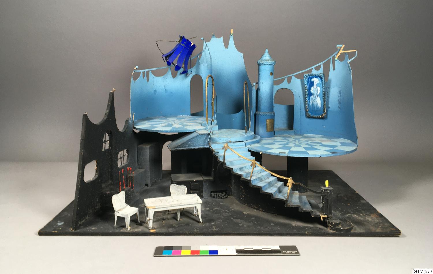 Interiör i två våningsplan, där bottenvåningen är svart, till vänster en utskuren vägg med dörr och två fönster, trappavsats och trappsteg framför dörren, t h en spis med spiskupa, i bakgrunden skåp och en dörröppning, på framscenen vitt bord och två stolar, till höger leder en svängd trappa upp till övervåningen, som är ljusblå med ett cirkelformat, rutmönstrat golv på var sida, utskurna väggar, blå lampskärm över det vänstra golvet, det högra har en kakelugn och porträtt på väggen, passager av trappor och bryggor går bakom och mellan dem, samt en smal trappa som bakifrån kommer upp från bottenvåningen.