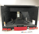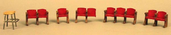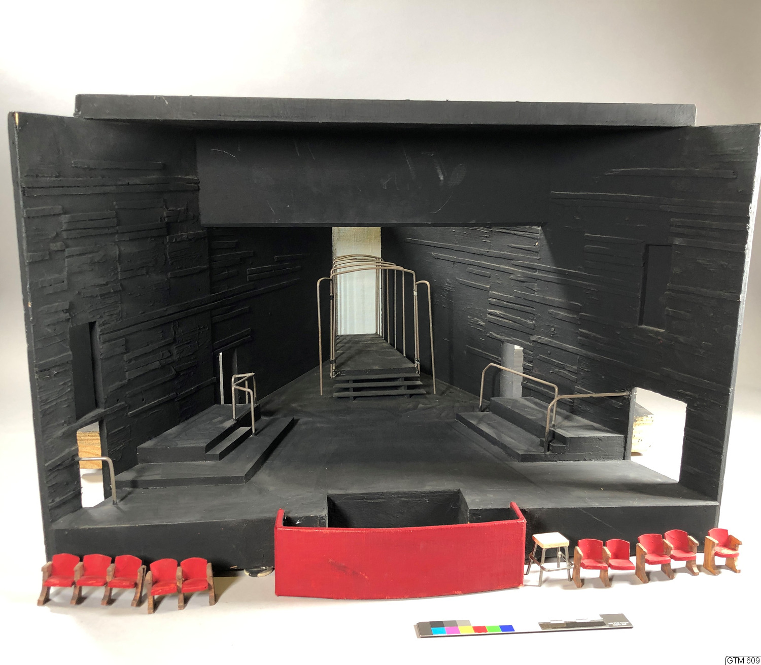 Modellen delvis gjord som tittskåp (strutformad) med svarta sidor, golv och delvis överbyggt tak, orkesterdike med röd utsida, väggarna har brädliknande ytstruktur, två dörröppningar på var sida, mell...