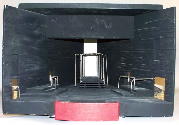Modellen delvis gjord som tittskåp (strutformad) med svarta sidor, golv och delvis överbyggt tak, orkesterdike med röd utsida, väggarna har brädliknande ytstruktur, två dörröppningar på var sida, mellan dem trappavsatser med stålräcken, i mitten en trappa upp till en avsats som leder upp till en lång brygga (löstagbar) och som går mot en öppning i horisonten och har stålportaler hela vägen, ljusgrå horisont. _b: sex lösa delar som består av röda stolbänkar, delvis sammanfogade, samt en pall.