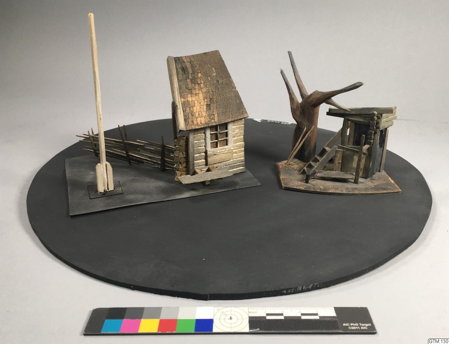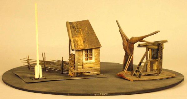 svart, rund grundplatta, två lösa dek delar som troligen har fungerat roterande på vridscenen. I bild: t v hörnet av en timrad stuga med fönster och väggfast bänk, t v därom en gärdsgård och en flaggstång. Till höger i bild: ett naket träd, ett skjul med stege. Dekorationen målad i brungula och grå nyanser.