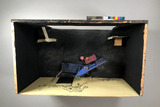 svart tittskåp utan lock, svarta insidor och golv, fonden (skåpets baksida) är av vit kartong med ett tecknat hus, murat på en klippa, en svart öppning i muren, framför fonden, på vänster sida, en avs...