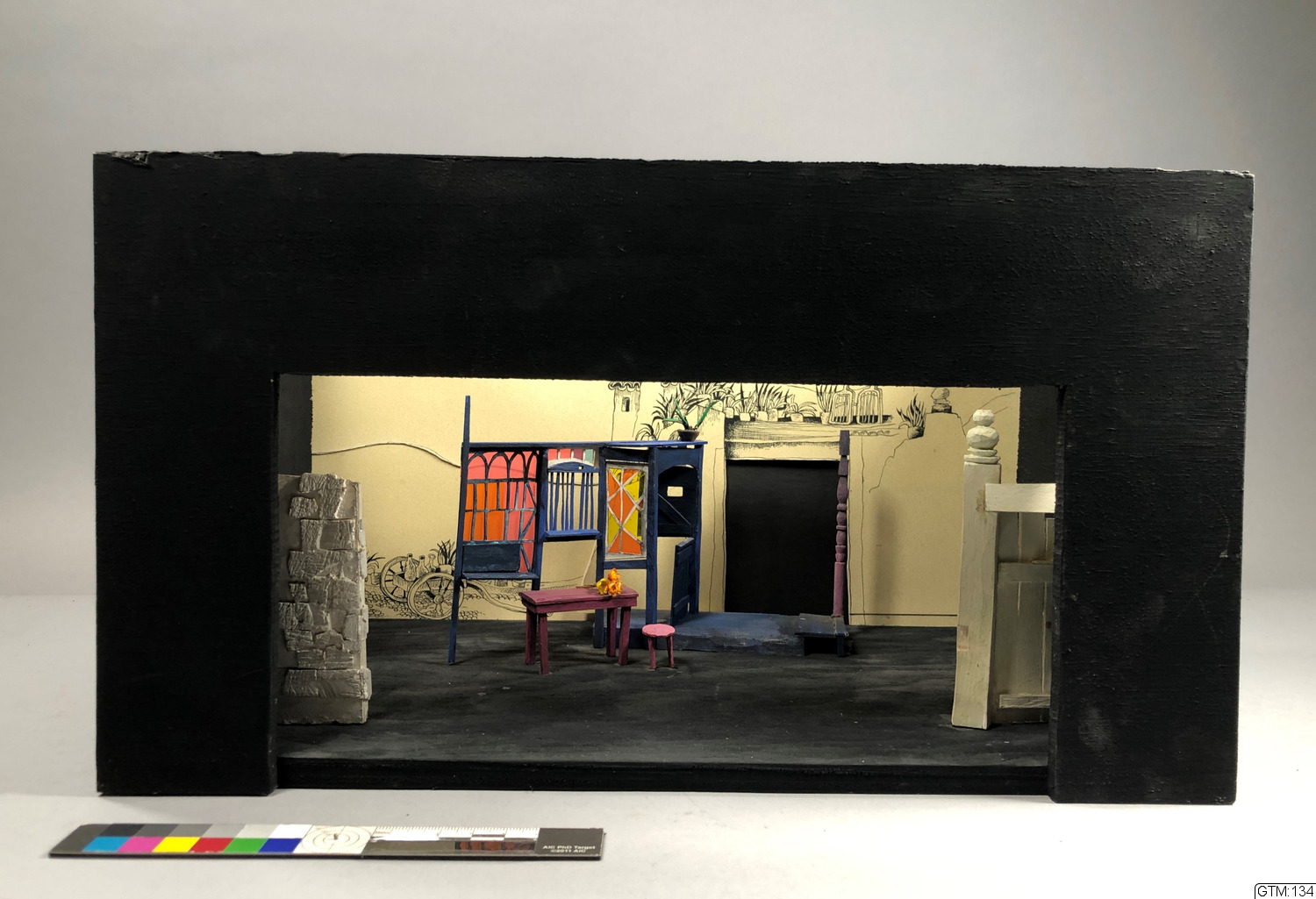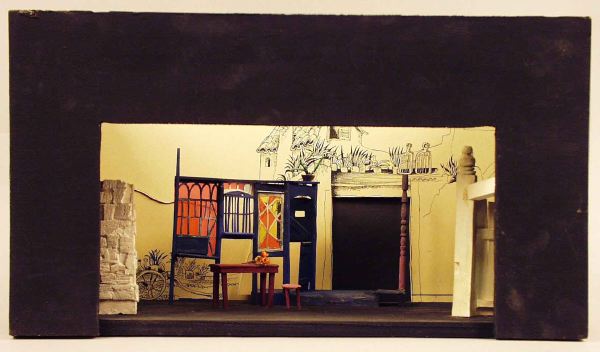 svart tittskåp utan lock, svarta insidor och golv, fonden (skåpets baksida) är av vit kartong med ett tecknat hus, murat på en klippa, en svart öppning i muren, framför fonden, på vänster sida, en avsats med blå utskuren fönstervägg med färgade glas, avsatsen blå, lila bord och pall framför, längst fram på vänster sida del av en vit mur, på höger sida en vit portal med träplank bakom.