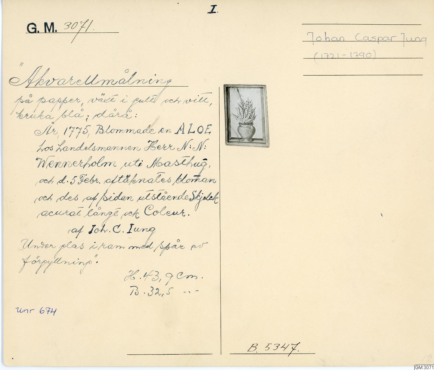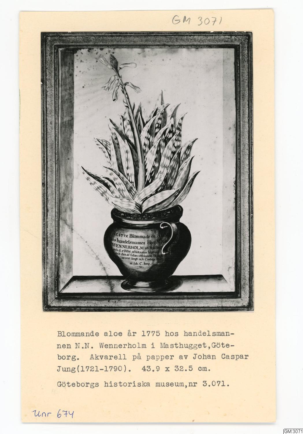 "År, 1775, Blommade en ALOE hos handelsmannen Herr N:N: WENNERHOLM uti Masthug, och d. 5 Febr. avtäknates bloman ock des af sidan utstående Skjelck acurat långt ock Coeleur af Ioh.C.Jung."