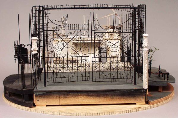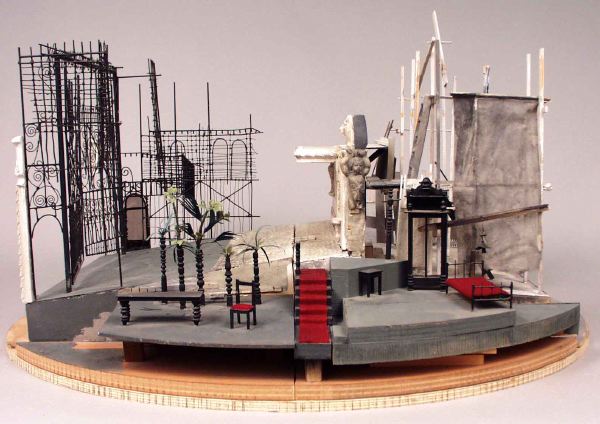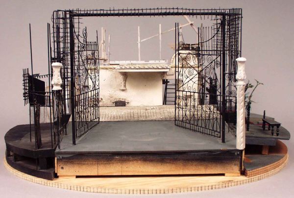 En cirkelrund grundplatta med olika scenbilder. Bild _a: ljusgrå brädväggar och bryggor, en smal grå trappa, bakgrundsväggen med murstruktur, gråvitt golv. _b: troligen två scenbilder varav den vänstra har vita, glesa bräd- och nätväggar med dörr, vitt golv, den högra scenbilden har svart golv och ståltrådskonstruktion som vägg. _c: höga, rikt dekorerade smidesportar med vita pelare på var sida, sluttande grått golv bakom som överst är stenbelagt framför en vit fasad, som har ett tak ut från väggen, en port t h och ett lejonhuvud snett ovanför t h. _d: samma scenbild som c men med portarna öppnade. _e: mörkgrått golv med en trappa i mitten som har en röd matta, t v därom svart bord och stol, palmer bakom, på höger sida om trappan en grå trekantig plattform, ett svart bord och skåp, och svart säng med rött överdrag.