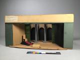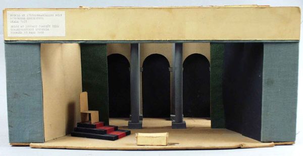 Ljusgrönt proscenium, sättstycken och kappor, på vänster sida en svart tron med en tronstol, grå kolonner och valvbågar i bakgrunden.
