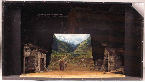Svarta sidor och fondvägg och proscenium, jordfärgat scengolv som fortsätter upp mot fondväggen, en landskapsbild med en väg som leder in i en grön dalgång med berg- och fjälllandskap i bakgrunden, mot framscenen på båda sidor, står delar av murade husfasader med glesa brädtak, på höger sida längst fram syns framdelen av en brun dragkärra, i mitte på scenen står tre figurer, två män och en kvinna,...