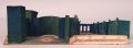 Två parker intill varandra i mörka grönblå nyanser, den på vänster sida består av hög formad häck i halvcirkel med öppningar på båda sidor, till höger leder öppningen in till parken vid sidan om med trappsteg upp till en avsats med balustrad, bakom den går i diagonal linje formade häckar med öppningar mot sidorna och avslutas i fonden med tre bågformade öpnningar.