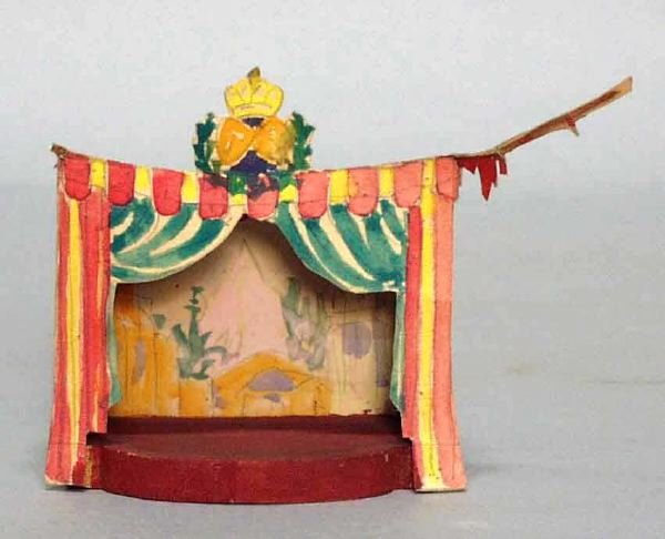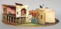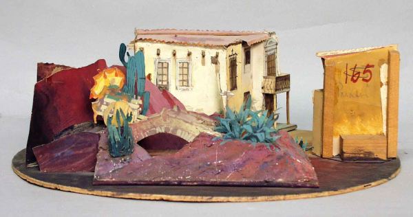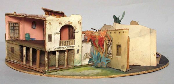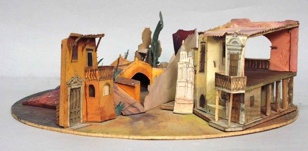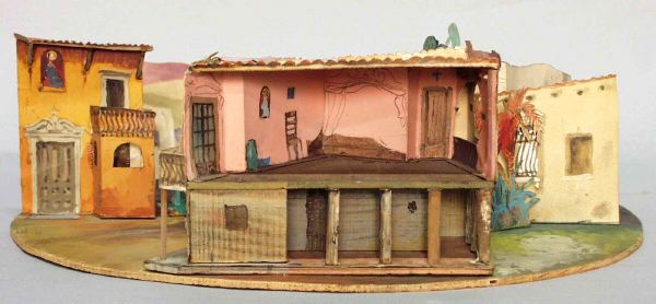 Modellen har fyra scenbilder. _a: hus med rosafärgat tak och i två våningar, bottenvåningen är exteriören på huset med pelare som går från väsnter till höger runt hörnet och håller upp övervåningen som består av interiören av ett rum med rosa väggar, på vänster sida dubbeldörr ut mot balkong, på höger sida bågformad öppning ut till en balkong. _b: samma hus sett från höger sida med ljusgrön fasad med den bågformade öppningen över balkongen, t h därom en mur som fortsätter i vinkel med en ljusgul husfasad med gallerfönster, palmer i hörnet, grönt golv. _c: en rosalila sluttning i förgrunden med gröns kaktusar och en bro med valv, en dragkärra är placerad på bron, mörka vinröda klippor framför baksidan av huset i _a-bilden. _d: på vänster sida del av fasad i orangegult med en ljusgrå port, t h därom en utbyggnad med balkong över, madonnabild på väggen, på höger sida är vänstra sidan av huset i _a-bilden. _e: detalj Mått:bredd:12, höjd:10, djup:4,5. liten scen med vinrött golv, gul- och rödrandig ridå, fonden målad med hus och bergslandskap, över scenen ett emblem med lagerkrans och krona.