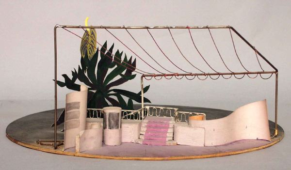 ståltrådskonstruktionen sammanfogad och fasthållen med tunn ståltråd som går igenom den tunna grundplattan av trä, övriga dek delar av trä, ståltråd och papper är limmade på och mot varandra och på gr...