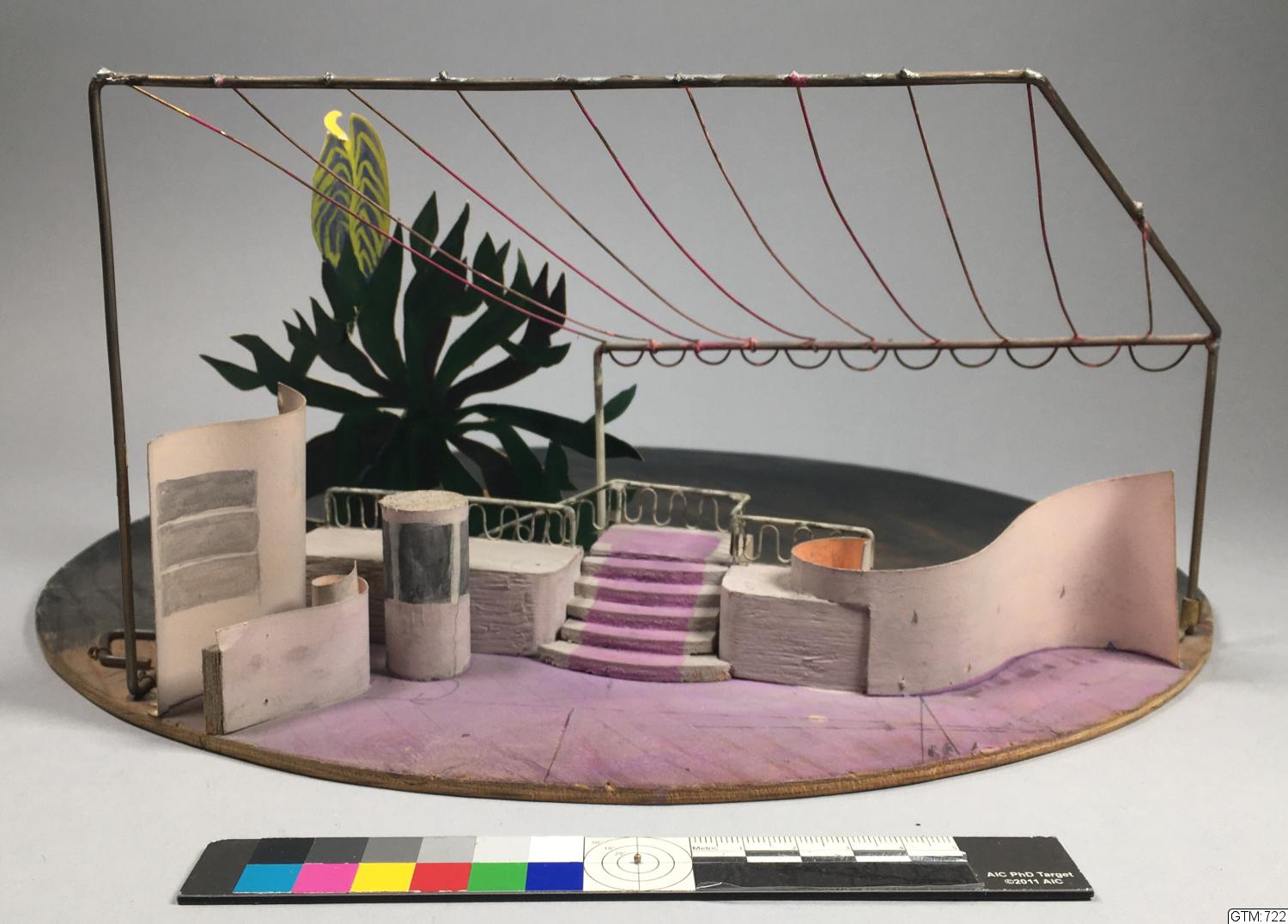 Cirkelrund grundplatta. en ståltrådskonstruktion utgör ett snedställt tak, i mitten av scenen kommer en trappa ner, bakom den och på sidorna avsatser går balustrader, till vänster på framscenen finns en bardisk framför väggen, på höger sida är väggen svängd i båge, allt är målat i rosalila nyanser, en stor kaktuslikande grön växt i bakgrunden.