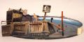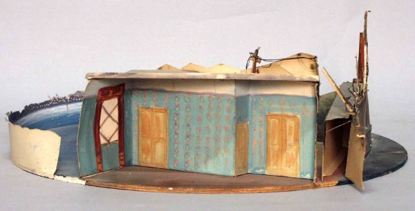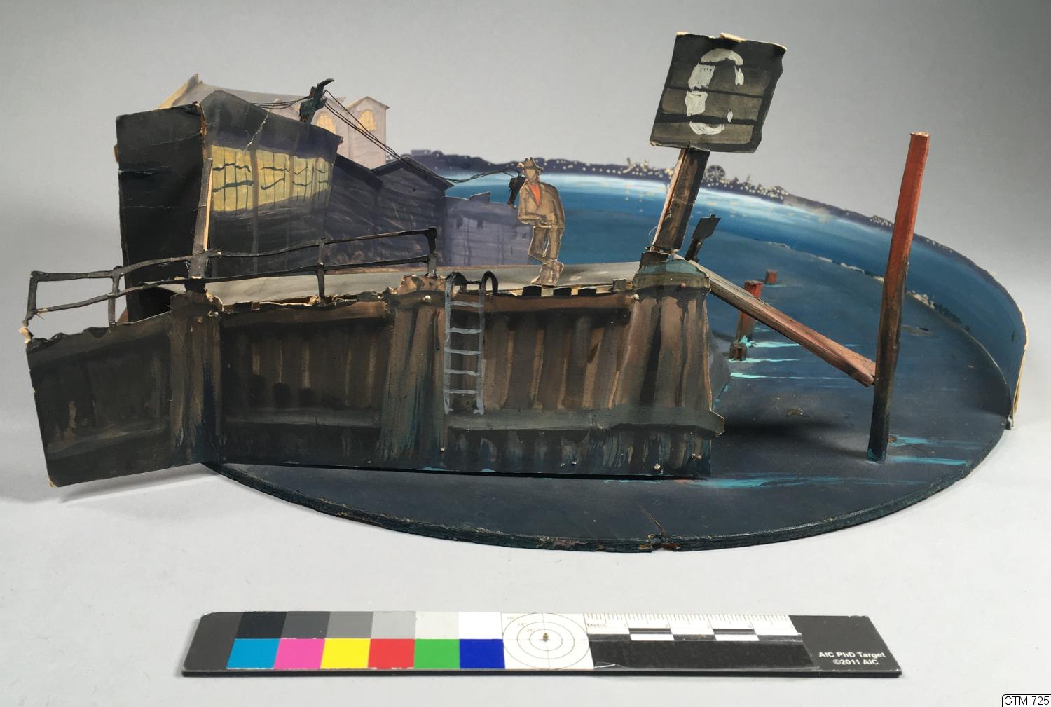 Två scenbilder på cirlerund grundplatta. _a: Hög kajkant på pålar med staket efter kanten, en mansfigur står på kajen, en träskylt mäsrk med C till höger om honom, i bakgrunden hamnskjul och telefonstolpar, blå rundhorisont med vattan och stad med belysning. _b: rum med blågröna väggar och rosa mönster, på vänster sida ett fönster, två dubbeldörrar och en enkeldörr på den vunklade fondväggen, tak över.