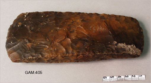 Tunnackig yxa med oslipad yta, vilket är mindre vanligt. I tid hör denna yxtyp hemma i äldre delen av yngre stenålder dvs för ca 5000 år sedan. Någon uppgift om hur den hittats finns ej utom att den kommer från Uddegården i Göteve socken i Västergötland. Yxan fanns i museets samlingar 1885.