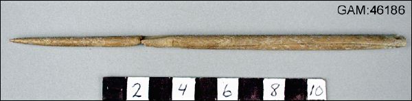 • Nålen är av ben och har ett hål som går från änden och ut i sidan.