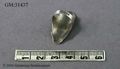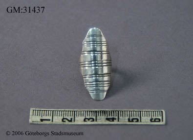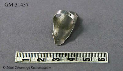 • Syring/sysköld, sybehör påminnande om en smyckering. Av silver ,en synliga stämpel som dock ej gått att läsa. Syskölden har en rektangulär sköld med extra avrundad spets på kortsidornas mitt samt mönster av inpräglade ränder, av olika bredd, ordnade i grupper. omväxlande tre och två ränder.