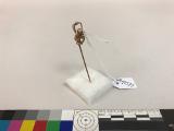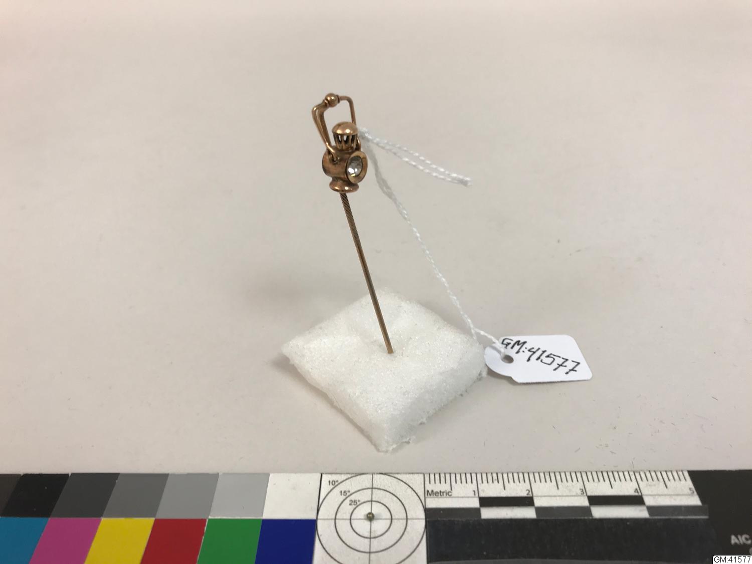 • kråsnål möjligen förgyllt silver, i toppen av nålen är en liten handlykta i miniatyr av metallen; med lyktans glas av en genomskinlig sten.