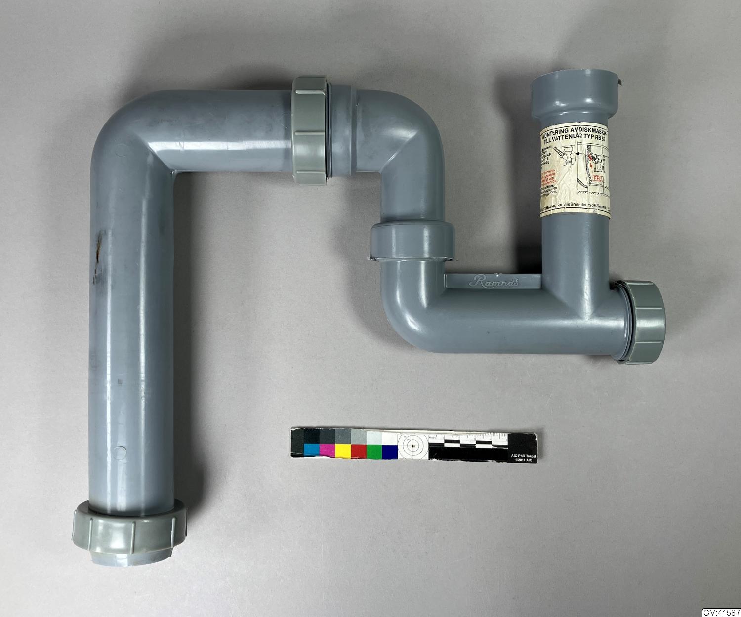 • Vattenlås av typ RB 50. Grått plaströr i tre isärtagbara delar. Märkt "Ramnäs".