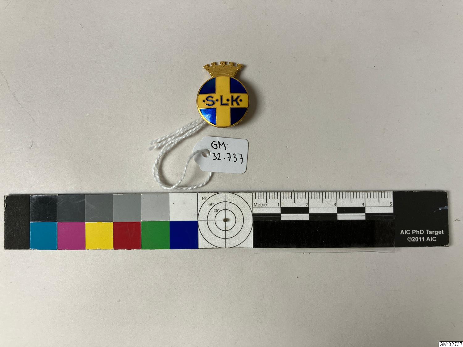 • Runt rockmärke av gulmetall, upptill torn med 5 tinnat. Emaljerat med gult kors på blå botten samt text S.L.K (=Sveriges Lottakår). Nål på baksidan.