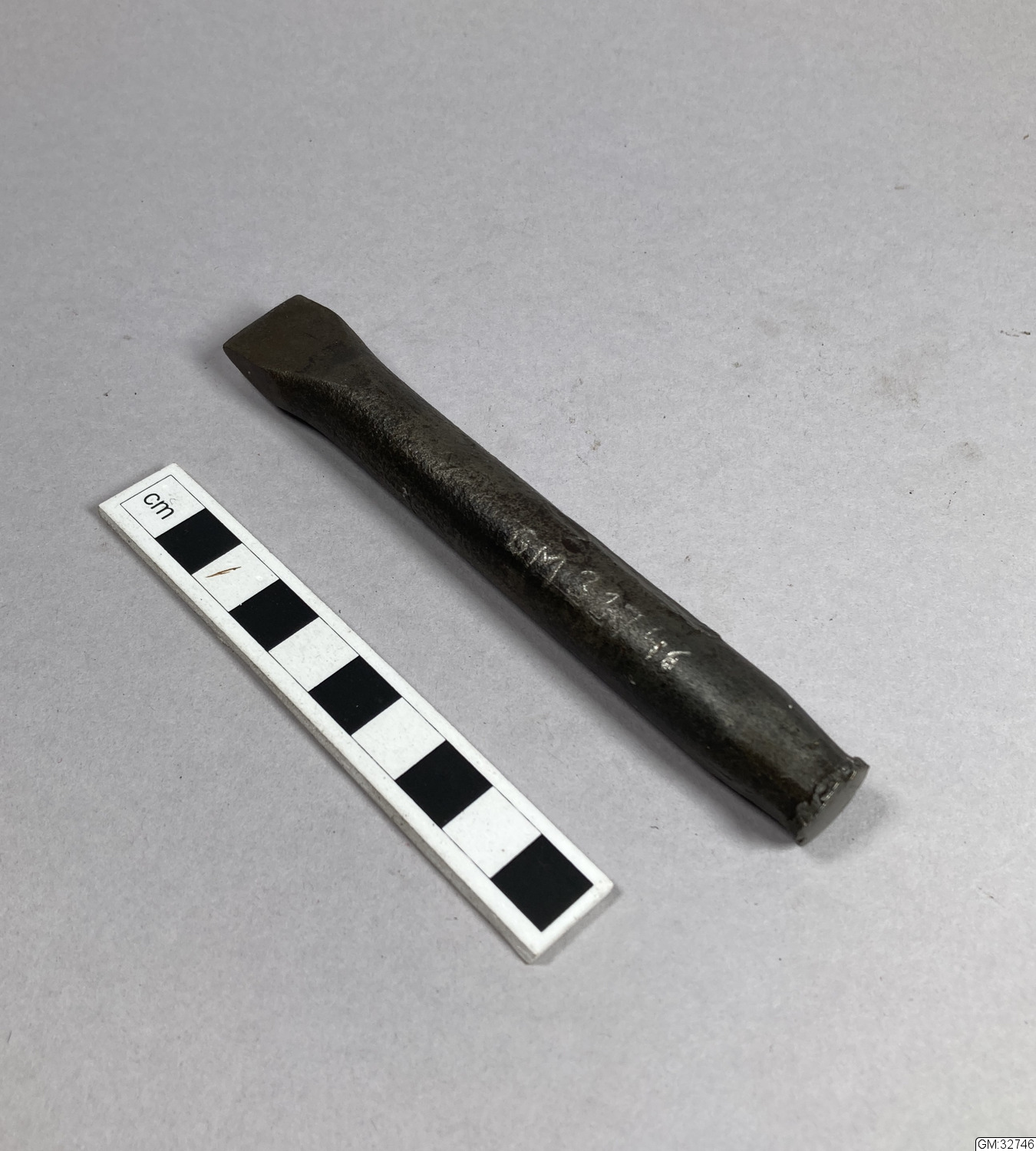• Stenhuggarmejsel (-järn). Verktyg av massivt järn med slagyta i ena änden och en avfasad rak egg i den andra. Avsedd för arbete i hårdsten. Foto se GM 32 741.