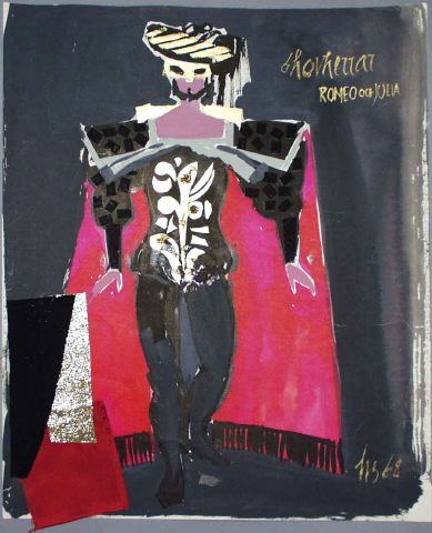 En man med svart hakskägg bär guldmask för ögonen, iklädd barett i guld och svart med band baktill, en framtill gulddekorerad svart kort jacka med puffärmar och smal ärmlinning, svarta trikåer, bär lång rödfodrad mantel med krage i svart och guld vilande på axlarna, grå bakgrund. Tygprover fästa med nål på vänster sida av skissen.