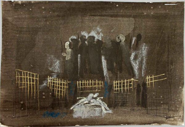 Hela skissen har brungrå bakgrund, fem nätmönstrade kulisser i halvcirkel, mitt på scenen en liten vit uppbyggnad med två diffust tecknade figurer liggande ovanpå, i mitten ovanför kulisserna svävande diffusa mörka figurer. (Obs! det svarta gav reflex på fotobilden)