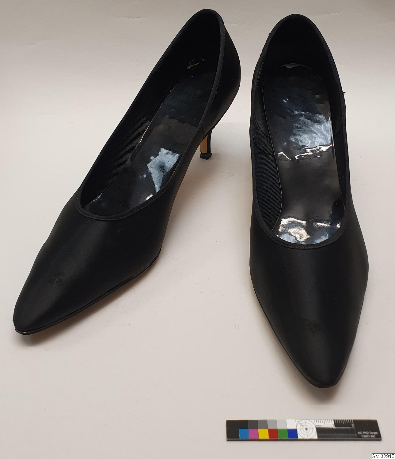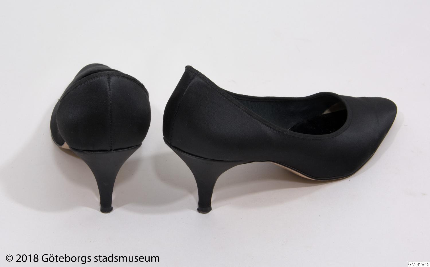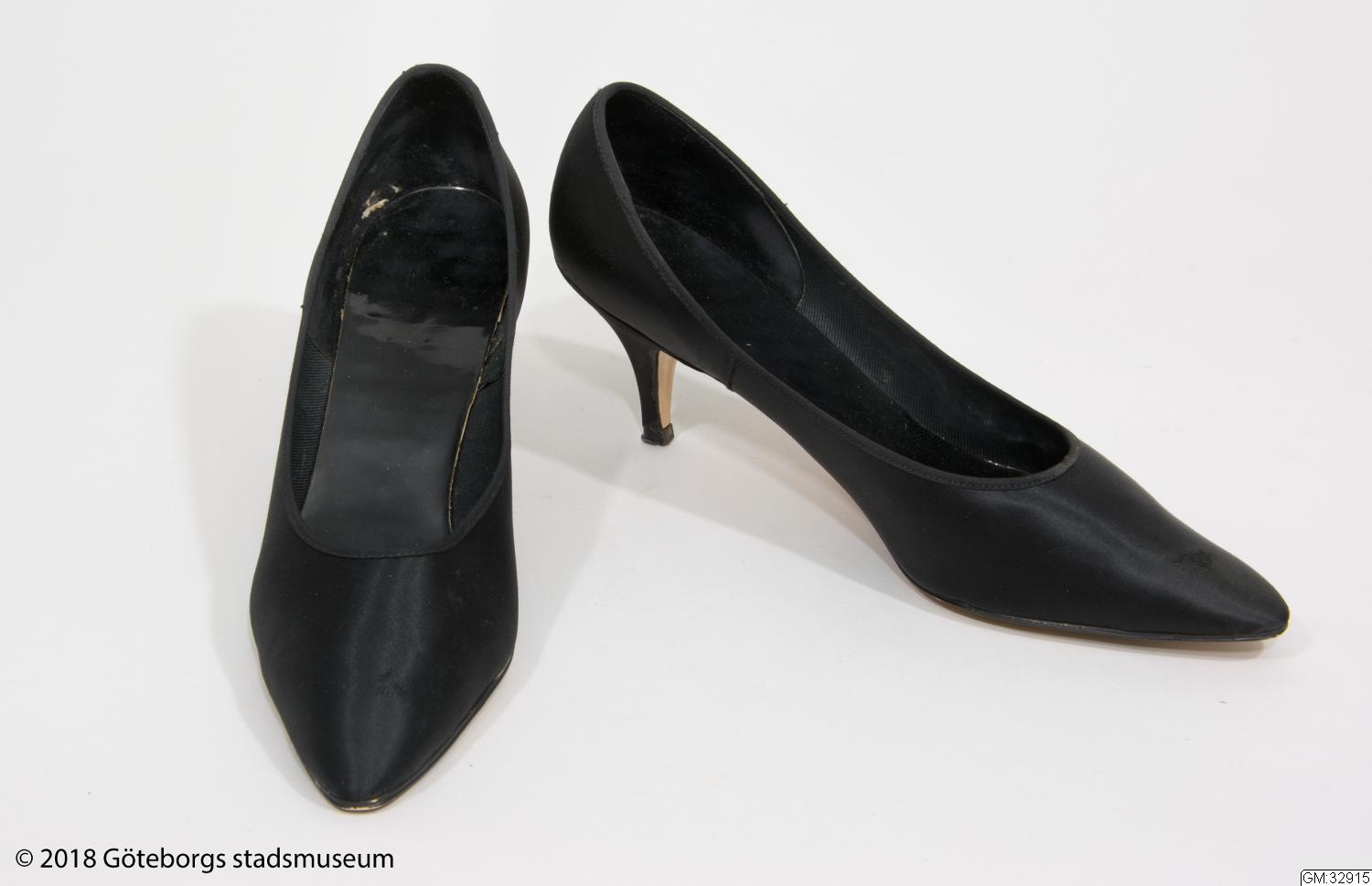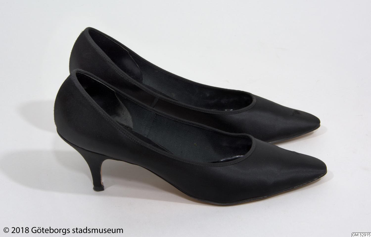 Aftonskor för dam. Pumps av svart satängsiden med spetsiga tår och sylvassa klackar. Fodrade med svart bomullstwills och svarta plastsulor. Storlek 7 (40).