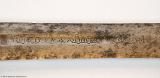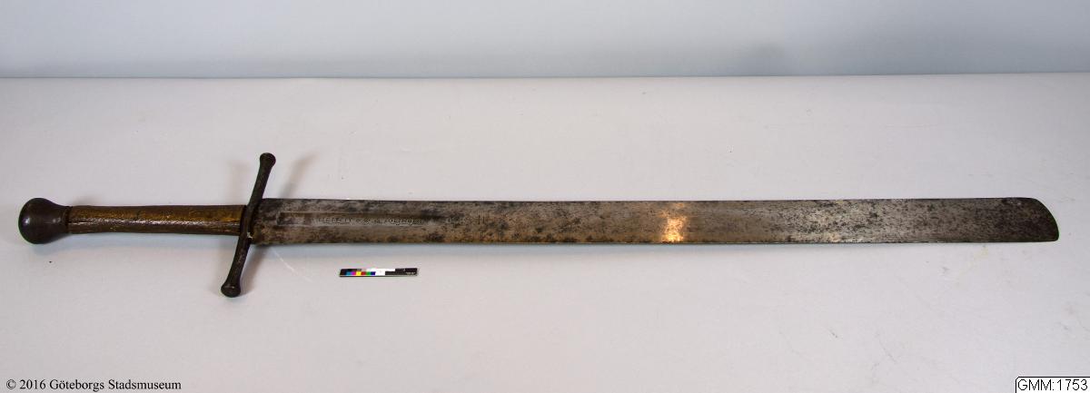 Bödelssvärd med texten "ME FECIT SOLINGEN", vilket betyder "Solingen har gjort mig". Solingen är en stad i Tyskland, känd för sin tillverkning av vapen. (GMM:1753) [Göteborgs födelse, 2017]