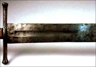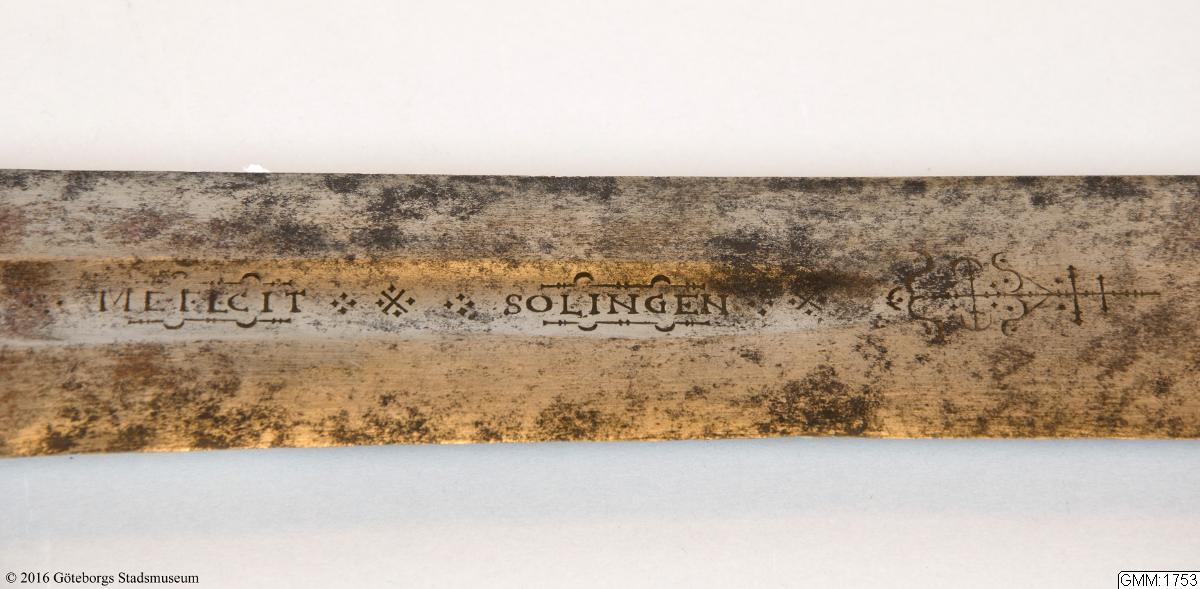 "Bödelssvärd:1600-talet. Klingan nedtill afrundad, märkt: ME FECIT SOLINGEN. Fästet af järn för två händer med rak parerstång; päronformig knapp och kafvel av trä. Vapentillverkningen i Solingen stod högt i rop redan från midten af medeltiden; särskildt solingerklingorna voro mycket berömda." Ur: Göteborgs musei rustkammare, katalog och vägledning för besökande utarbetad af Lagerberg, 1893.