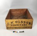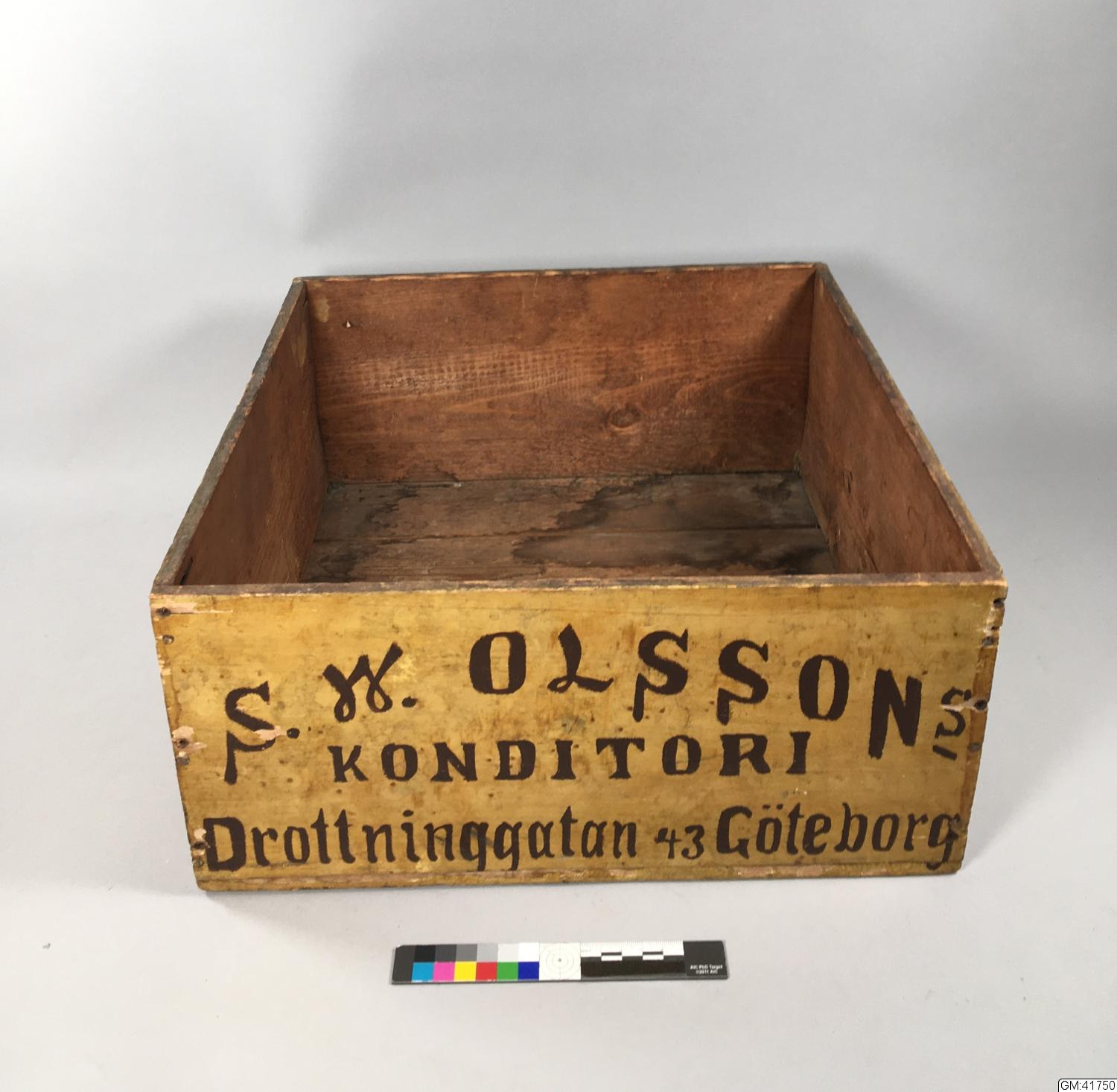 • En gulmålade trälåda med brunmålad text vilken lyder: " S. W. Olssons konditori. Drottninggatan 43 Göteborg".
