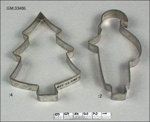 6 st pepparkaksmått: 1) pepparkaksgumma; 2) gubbe (se bild); 3) tomtegubbe med säck; 4) gran (se bild); 5) gris med tvärslå; 6) julbock. Gåva från Carl Otto Thiberg 1976.