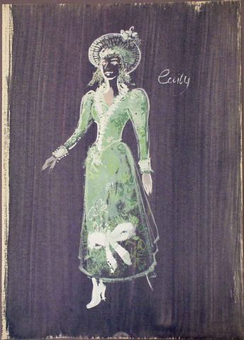 Ung kvinna med långt lockigt hår är iklädd hatt med brätten, ljusgrön mönstrad ankellång klänning med långa ärmar som har puff vid axeln, avsmalnande nertill med vit spetsmanschett, vit spetskrås i urringningen, stor vit rosett nertill på kjolen, vita skor. Skissen gjord i vitt, grönt och svagt rosa med gråmelerad bakgrund.