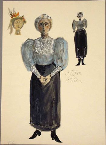 Kvinna med ljusgrått vågigt hår som bär pincené och är iklädd höghalsad blårandig blus med vit spetsisättning, fårbogsärmar med vita spetsmanschetter, ankellång mörkgrå rak kjol med svarta stickningar vid fållen, svarta snörkänger. Till vänster en liten detaljskiss med hatt och på höger sida en datalj av kostymen sedd bakifrån.