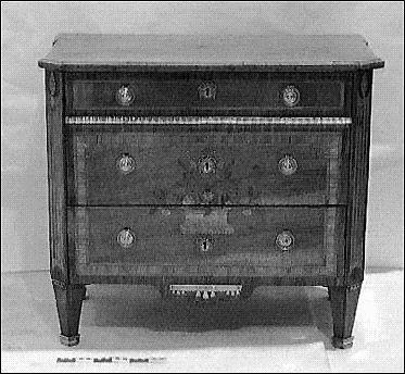 Byrå i fanerat päronträd och jakaranda. Inläggningar av lönn, en del grönbetsad. På framstycket en korg med blommor, på sidorna blomsterbuketter med band samt bårder. Lister, beslag, nyckelskyltar av mässing. Grå avtagbar marorskiva. Fötterna nedtill är nya. Skivan 90,8 x 53,7 cm. 1700-talets senare del.