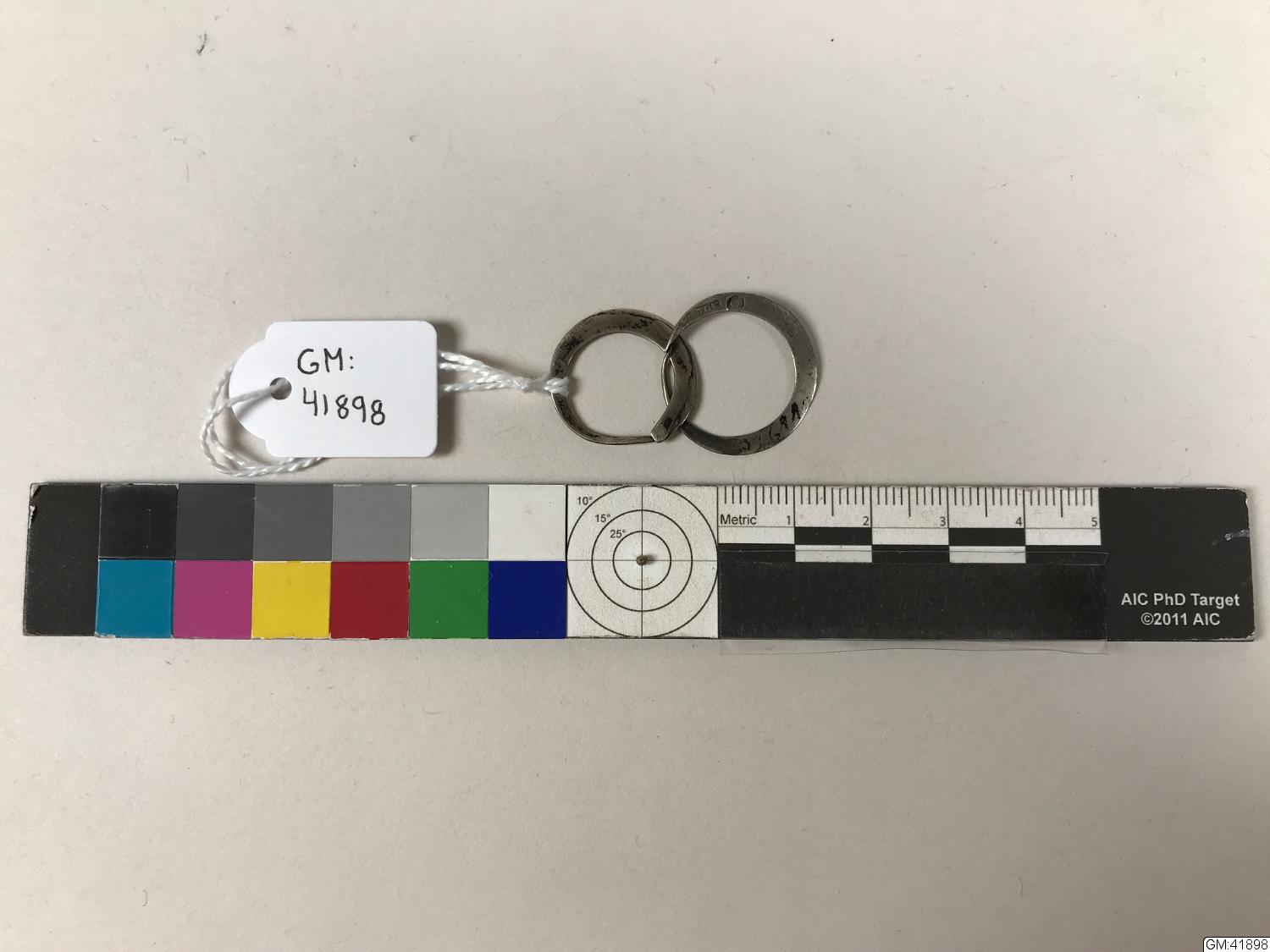 • Ett par örhängen, platta ringar av metall, troligen silver.