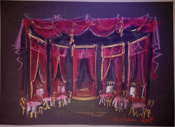 Skissen utförd på svart poröst papper. Två alkover på scenens sidor som har vit- dukat bord med stolar, röda draperier inramar dem, framför dem på scengolvet ytterligare bord och förgyllda stolar, i bakgrunden i mitten en rund avsats med trappsteg till en liten scen inramad av röda draperier, över hela scenbilden går en röd draperad suffit, golvet är målat svagt grönt.