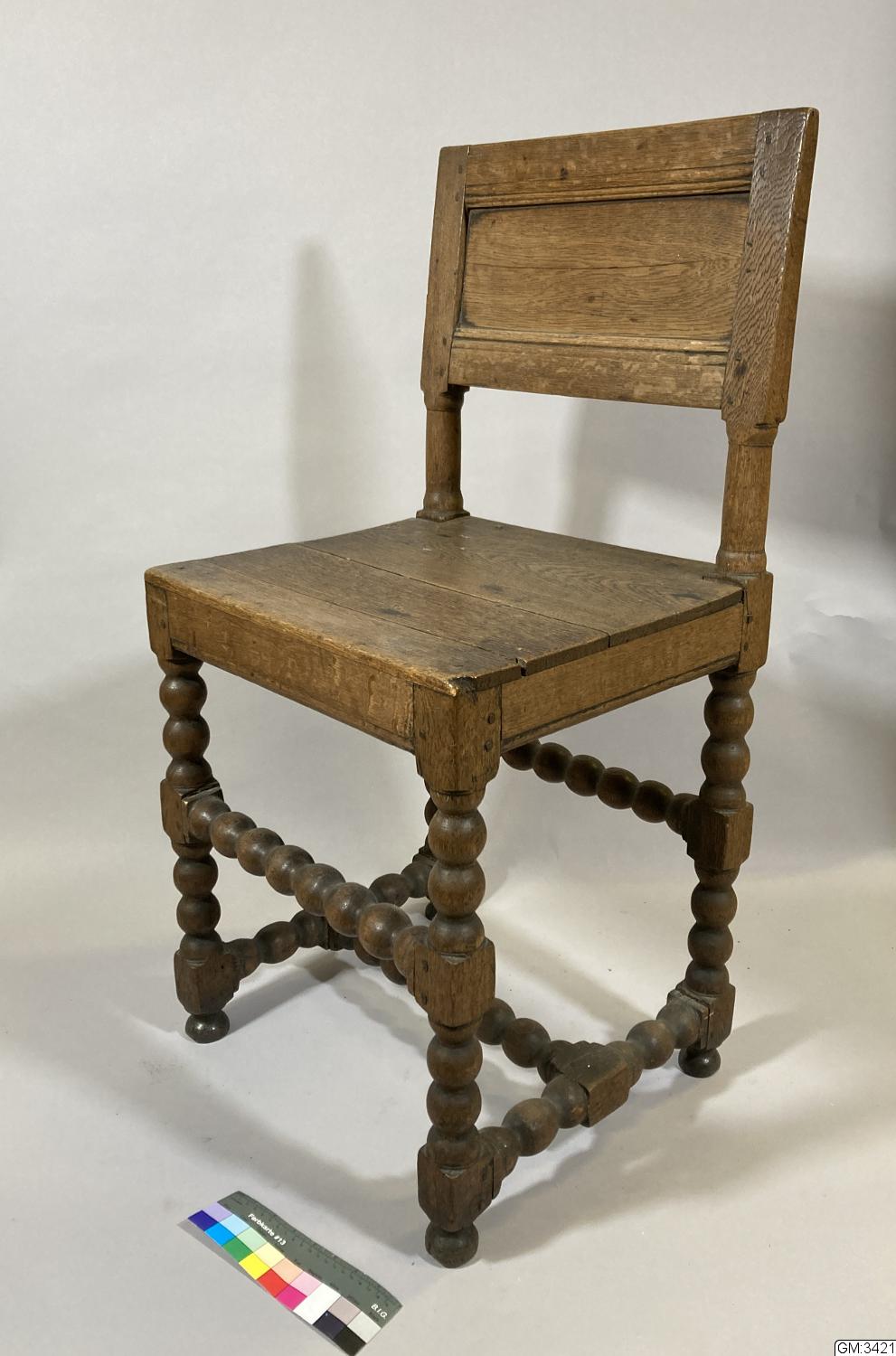 • Stol med rektangulär ryggbricka med två sidoståndare, upptill fyrsidiga nedtill runda. Enkelt profilerad med två horisontala lister. Kulsvarvat fotställ som möts i en H-kryss med två tvärslåar. [enl katalogkort/mhn]