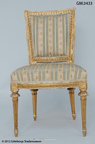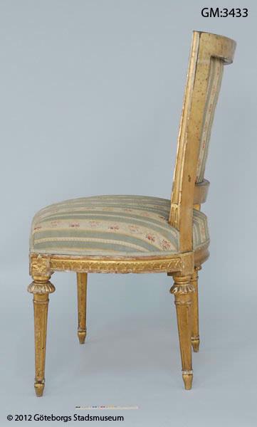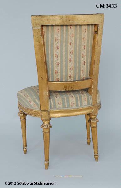 • Stolens delar är sammanhållna med tappkonstruktion. Benen är svarvade, har skurna kanneleringar i svarvade slätpartier och flueroner i anfang. Sargerna har skuren tandsnittsdekor. Ryggen är välvd och har raka linjer i trapetsform med skuren tandsnittsdekor. Både sits och rygg har sadelgjordsstoppning
